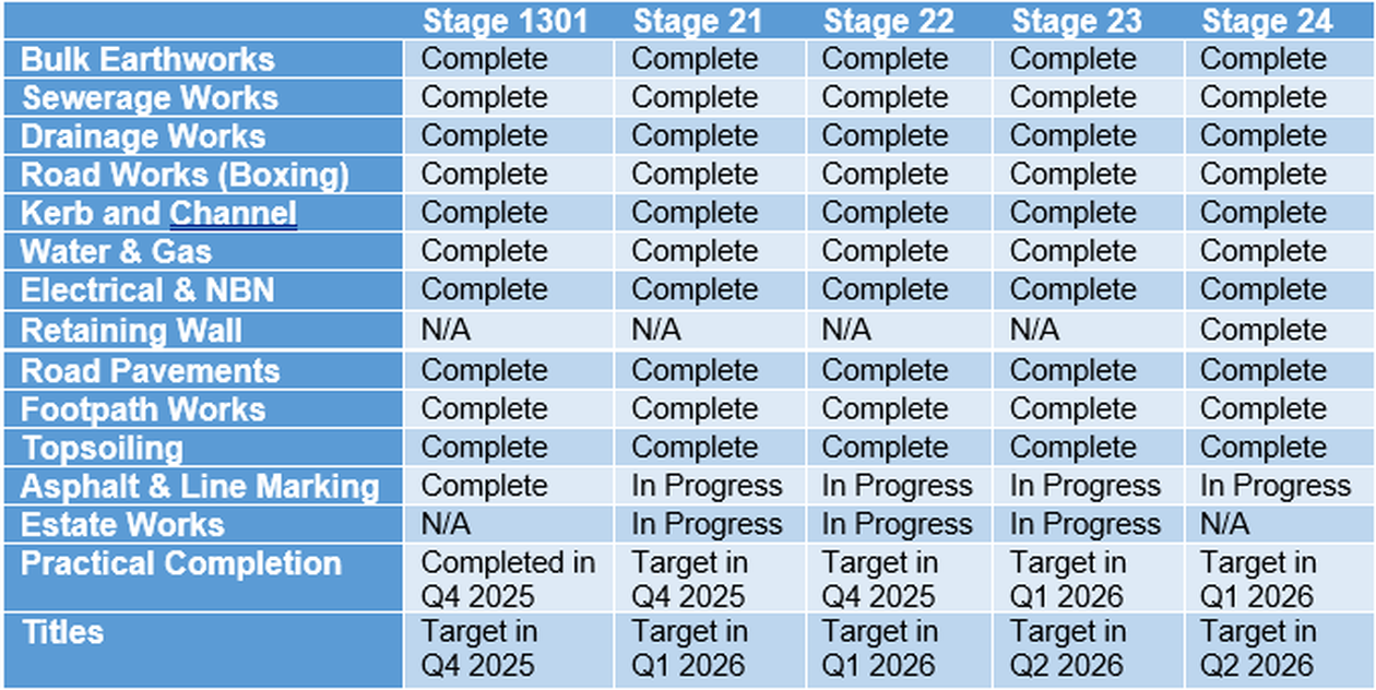 We finally received approval from Melb Water in late May and commenced construction of the culvert and associated creek works on 23 June 2025. This delay in Melb Water approval means settlements for stages 21 - 22 will occur in Q1 2026, and stages 23 - 24 will be in Q2 2026.