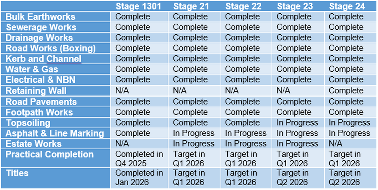 Construction works for Stage S1301 have been completed. Titles have been issued and settlement has occurred.