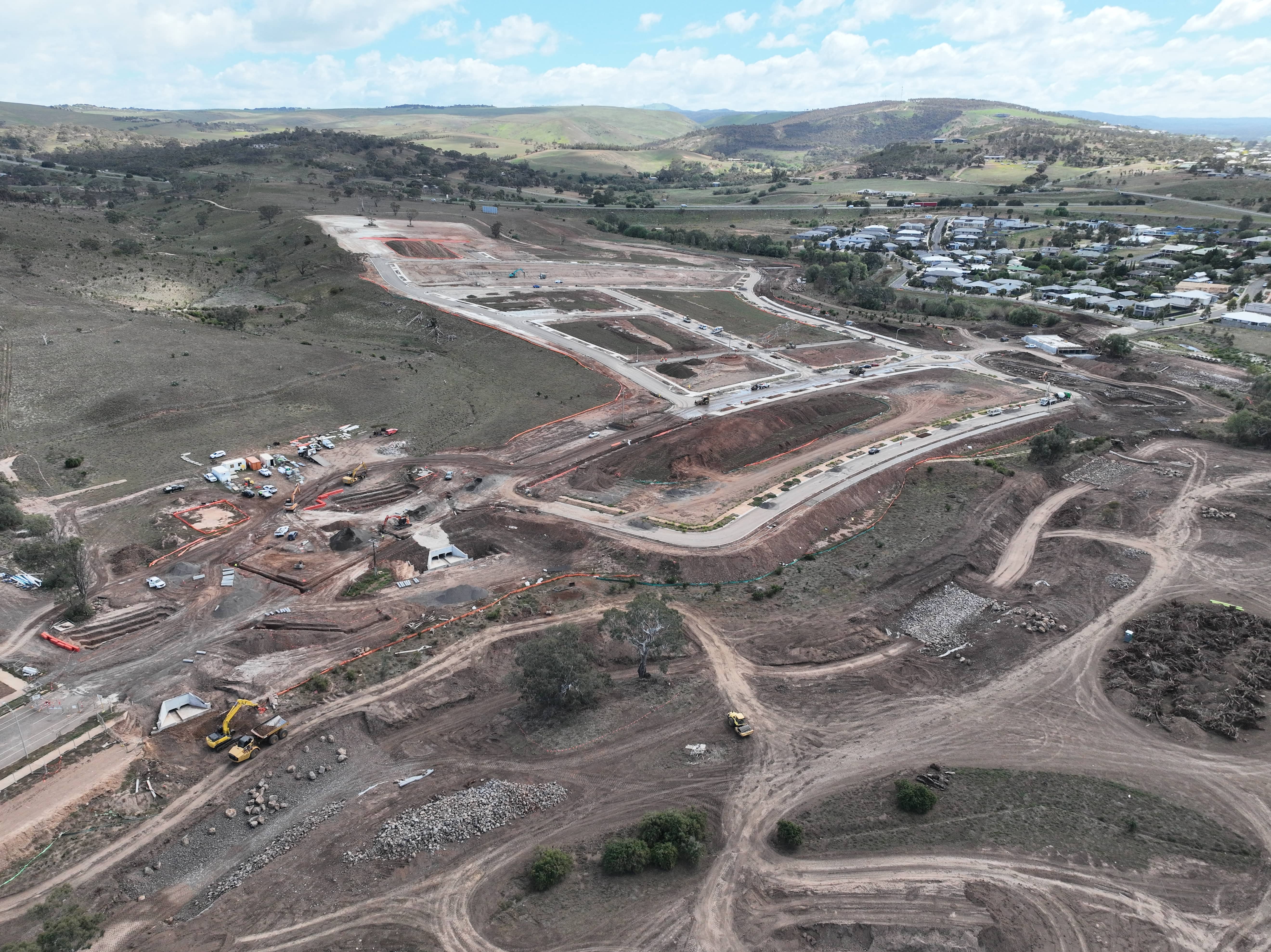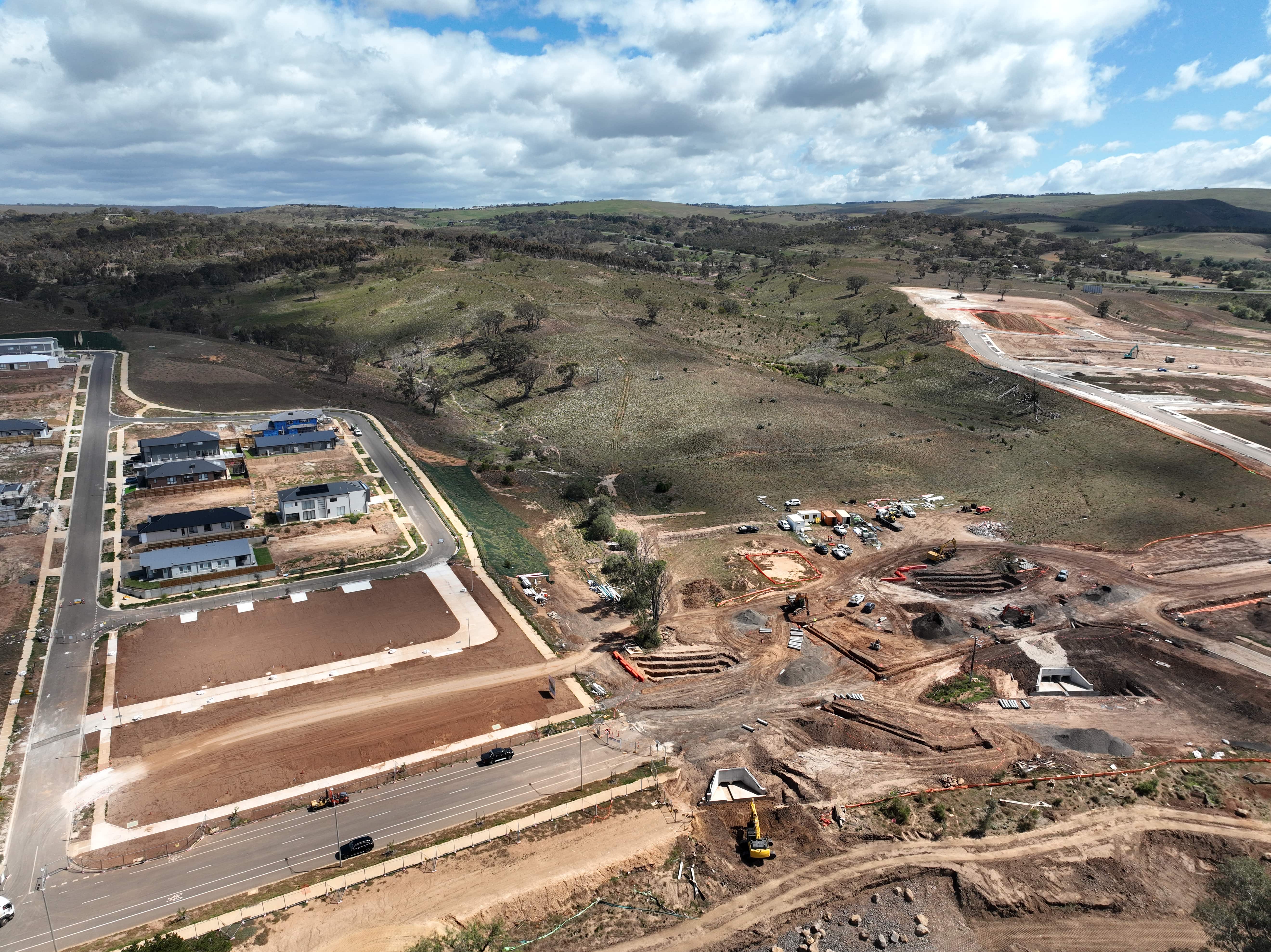 Stages 21-24 – The site works are progressing well, with major road formations and drainage infrastructure largely in place. Earthworks and retaining structures are ongoing, and the subdivision layout is now clearly taking shape.