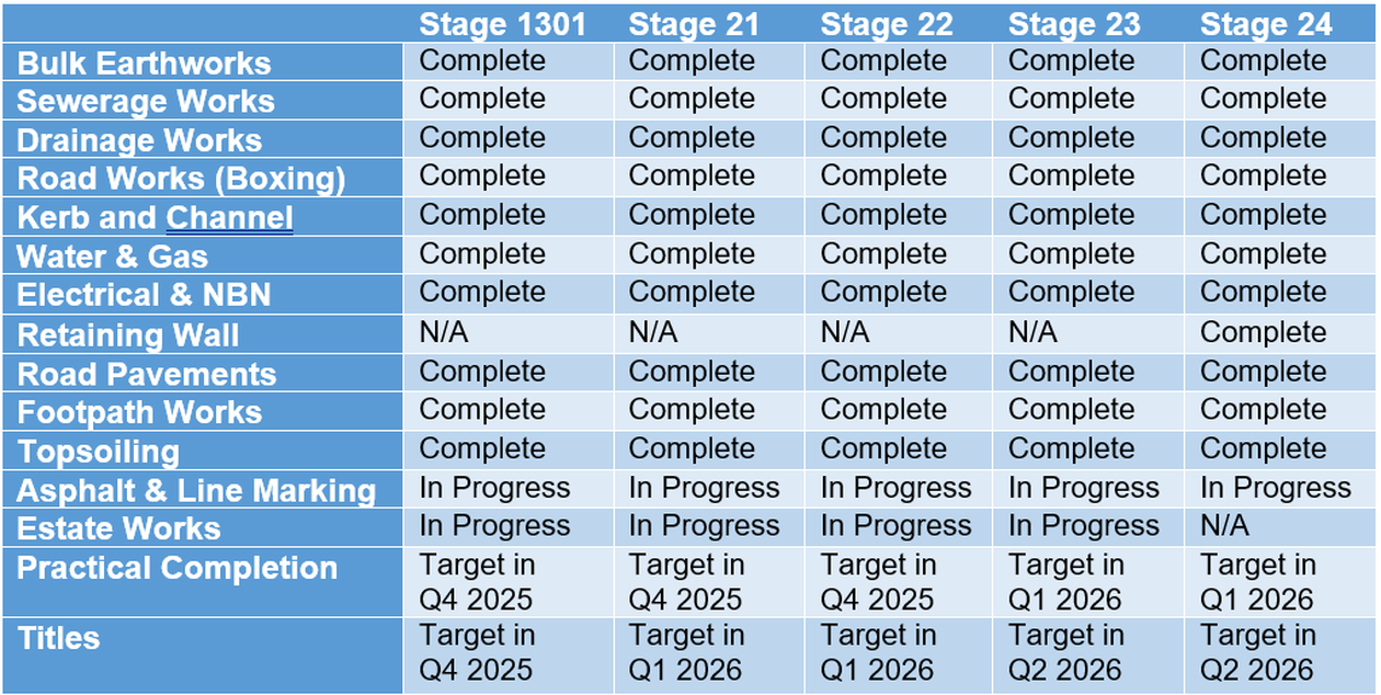We finally received approval from Melb Water in late May and commenced construction of the culvert and associated creek works on 23 June 2025. This delay in Melb Water approval means settlements for stages 21 - 22 will occur in Q1 2026, and stages 23 - 24 will be in Q2 2026.